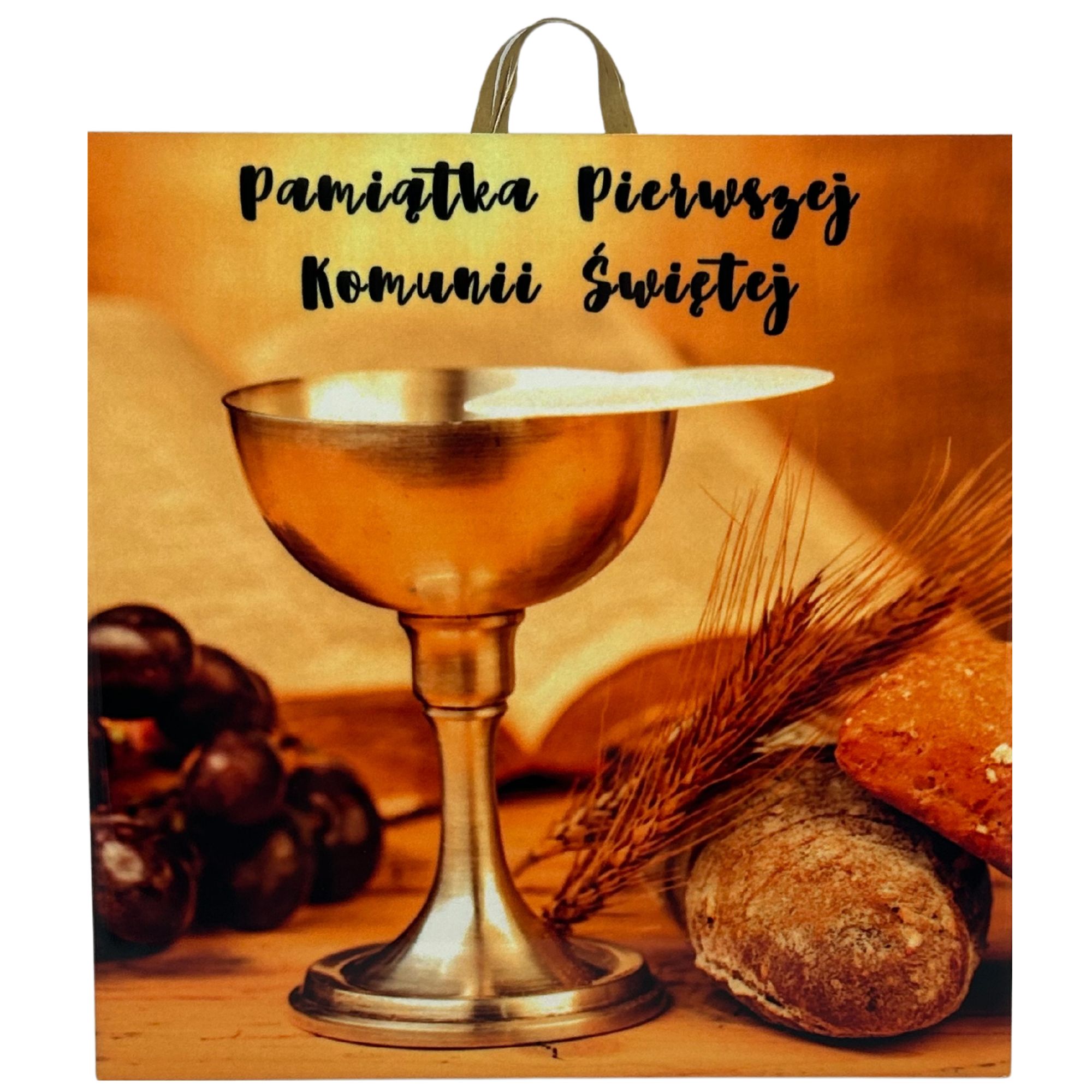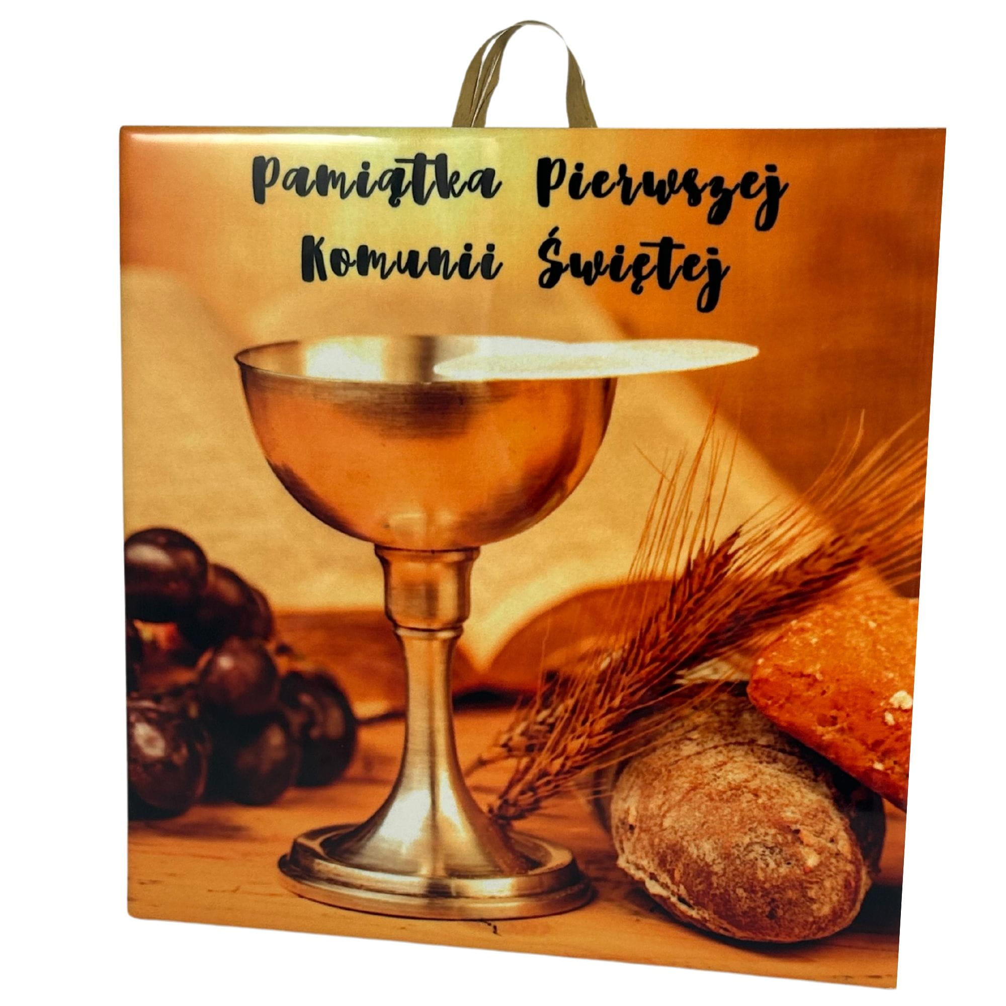 Obrazek kafelek - Pamiątka Pierwszej Komunii Świętej| Winogrono wykonany jest na płytce ceramicznej i posiada zawieszkę. Jego tył wykańczamy płytą korkową. Obrazek kafelek - Pamiątka Pierwszej Komunii Świętej| Winogrono przedstawia elementy związane z Pierwszą Komunią Świętą, ułożone na drewnianym stole. Widnieje na nim złoty kielich z białym opłatkiem. Za pucharem dostrzegamy otwartą biblię oraz bochenki chleba wraz z opierającymi się o nie kłosami zboża. Za kielichem umieszczone są także czerwone winogrona. U góry widnieje oświetlony napis: Pamiątka Pierwszej Komunii Świętej.