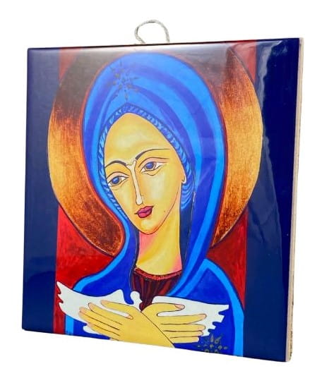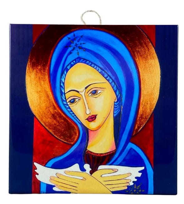 Obrazek kafelek - Pneumatofora - Jasna wykonany jest na płytce ceramicznej i posiada zawieszkę. Jego tył wykańczamy płytą korkową. Obrazek kafelek - Pneumatofora - Jasna przedstawia portret Matki Boskiej Pneumatofory. Maryja w dłoniach trzyma Ducha Świętego w postaci gołębia. Tło obrazka ceramicznego ma granatową barwę.