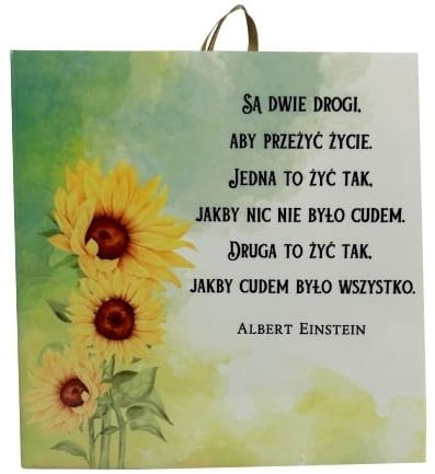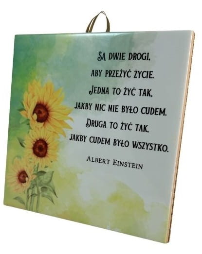 Obrazek kafelek "Są Dwie drogi aby przeżyć życie.." wykonany jest na płytce ceramicznej i posiada zawieszkę. Jego tył wykańczamy płytą korkową. Obrazek kafelek "Są Dwie drogi aby przeżyć życie.." przedstawia słoneczniki na zielonym tle. Widnieje na nim również cytat Alberta Einstaina: "Są dwie drogi , aby przeżyć życie. Jedna to żyć tak, aby nic nie było cudem. Druga to żyć tak, aby wszystko było cudem". Obrazek kafelek "Są Dwie drogi aby przeżyć życie.." wykonujemy metodą nanoszenia.