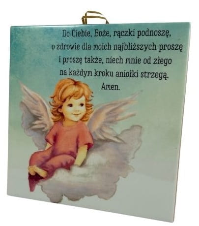 OBRAZEK KAFELEK "DO CIEBIE, BOŻE, RĄCZKI.."- róż wykonujemy na płytce ceramicznej z zawieszką. Jego tył wykańczamy płytą korkową. OBRAZEK KAFELEK "DO CIEBIE, BOŻE, RĄCZKI.."- róż przedstawia Aniołka oraz tekst modlitwy "Do Ciebie, Boże, rączki podnoszę, o zdrowie dla moich najbliższych proszę i proszę także, niech mnie od złego na każdym kroku aniołki strzegą. Amen."