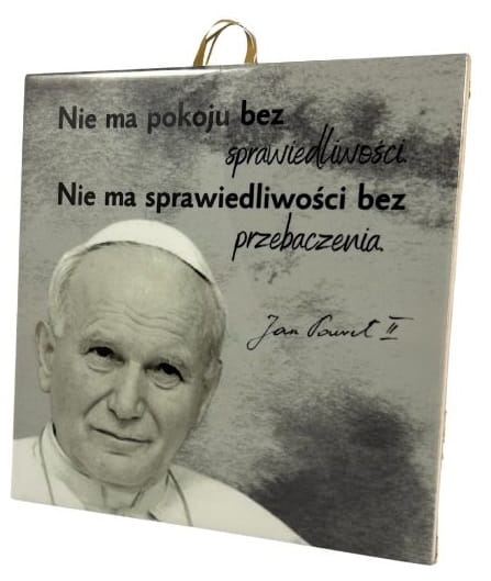 Obrazek kafelek - JAN PAWEŁ II "NIE MA POKOJU BEZ.." wykonujemy na płytce ceramicznej z zawieszką.Jego tył wykoańczamy płytą korkową. Obrazek kafelek - JAN PAWEŁ II "NIE MA POKOJU BEZ.." przedstawia Ojca Świętego Jana Pawła II oraz cytat: "Nie ma pokoju bez sprawiedliwości. Nie ma sprawiedliwości bez pokoju."
