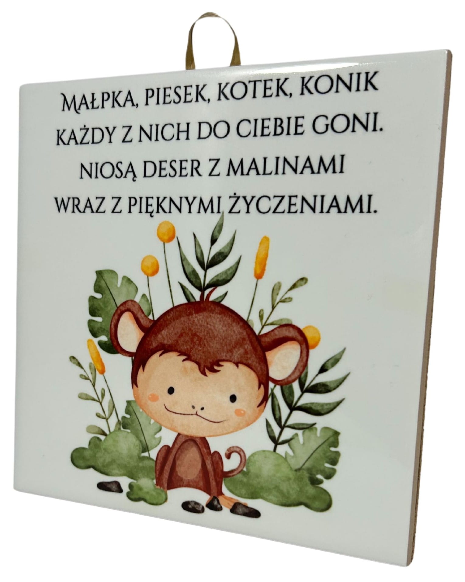 Obrazek kafelek "MAŁPKA, PIESEK, KONIK..." wykonujemy na płytce ceramicznej z zawieszką. Jego tył wykańczamy płytą korkową. Obrazek kafelek "MAŁPKA, PIESEK, KONIK..." przedstawia małpkę wraz z cytatem: "Małpka, piesek, kotek, konik, każdy z nich do ciebie goni. Niosą deser z malinami, wraz pięknymi życzeniami.".