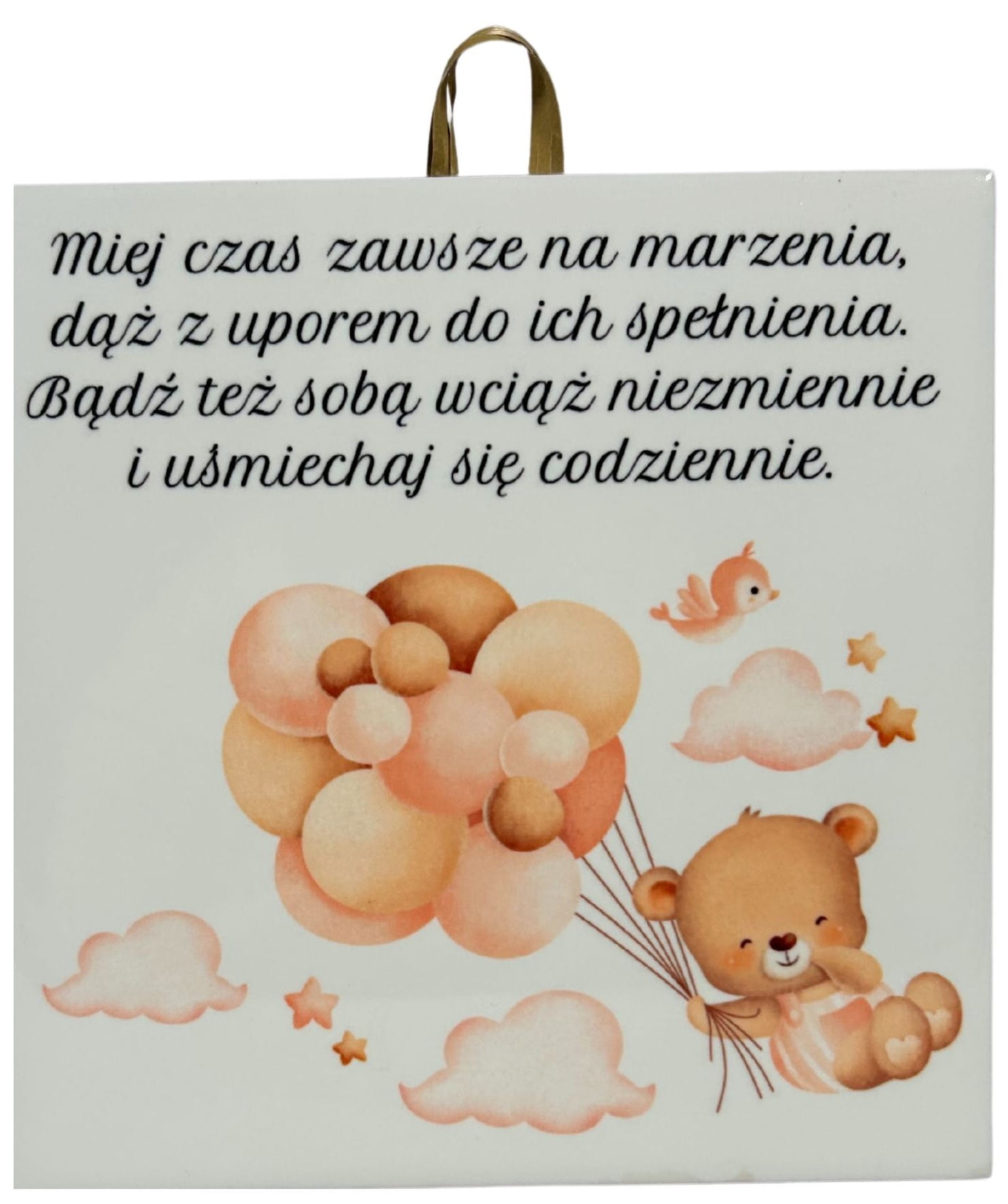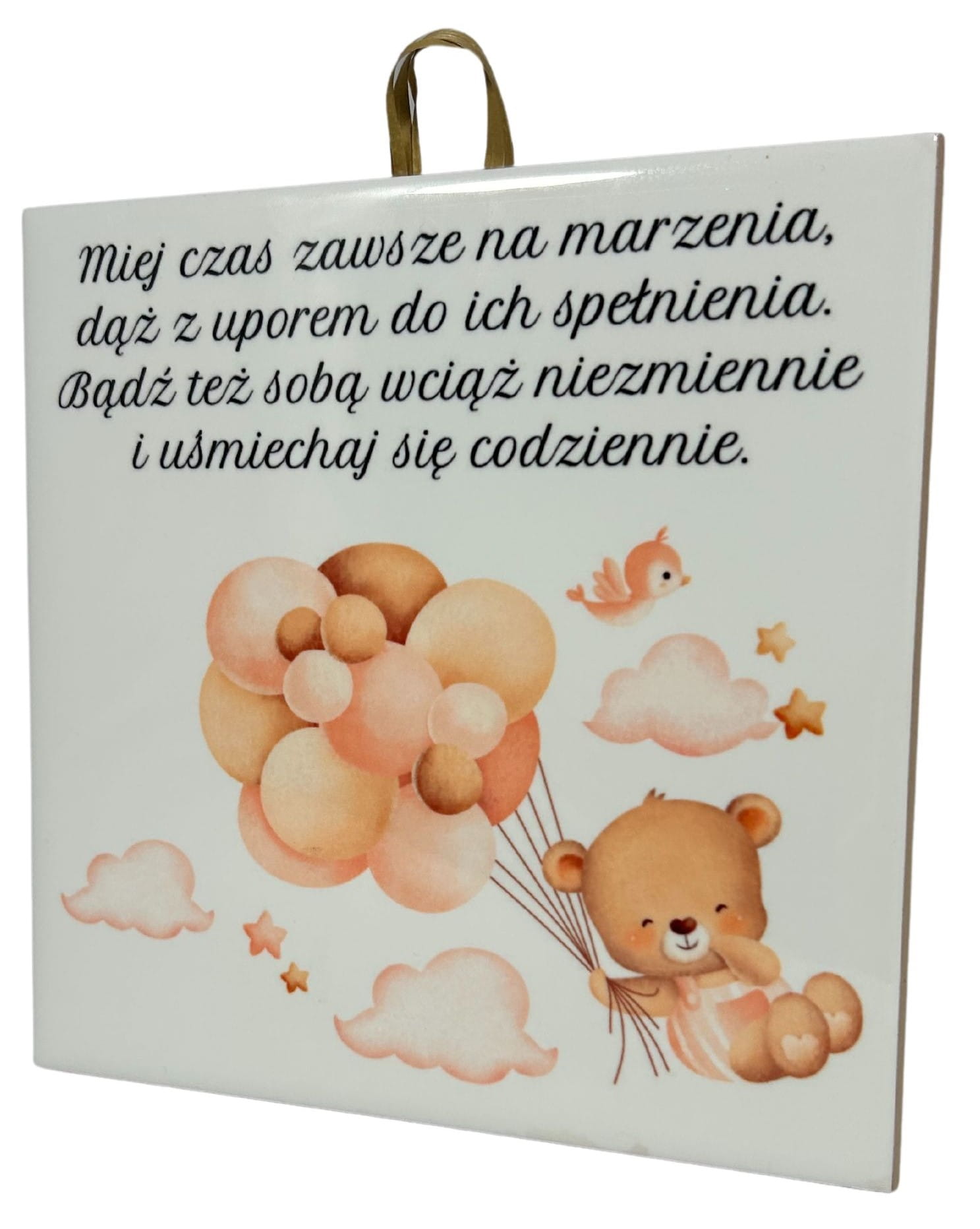 Obrazek kafelek "MIEJ CZAS..." wykonujemy na płytce ceramicznej z zawieszką. Jego tył wykańczamy płytą korkową. Obrazek kafelek "MIEJ CZAS..." przedstawia misia na chmurce z balonami wraz z cytatem: "Miej czas zawsze na marzenia, dąż z uporem do ich spełnienia. Bądź też sobą wciaż niezmiennie i uśmiechaj się codzienie."