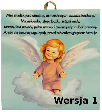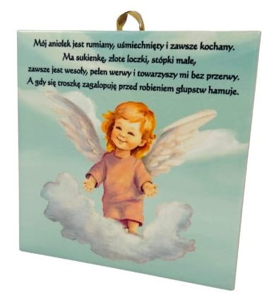 OBRAZEK KAFELEK "MÓJ ANIOŁEK JEST RUMIANY.." - róż wykonujemy na płytce ceramicznej z zawieszką. Jego tył wykańczamy płytą korkową. OBRAZEK KAFELEK "MÓJ ANIOŁEK JEST RUMIANY.." - róż przedstawia Aniołka oraz tekst "Mój aniołek jest rumiany, uśmiechnięty i zawsze kochany. Ma sukienkę, złote loczki, stópki małe. Zawsze jest wesoły, pełen werwy i towarzyszy mi bez przerwy. A gdy trosze się zagalopuję, przed robieniem głupstw hamuje."