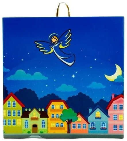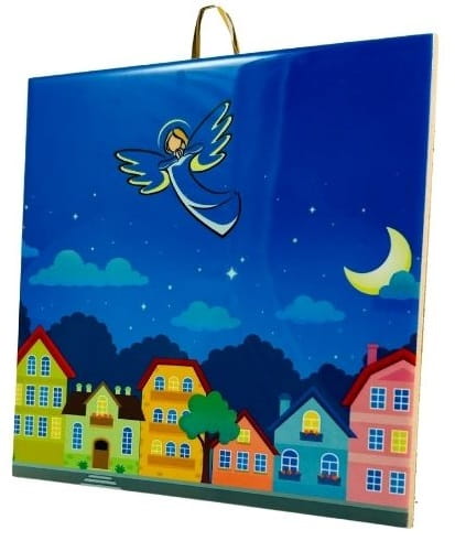 Obrazek kafelek - Anioł nad miastem wykonany jest na płytce ceramicznej i posiada zawieszkę. Jego tył wykańczamy płytą korkową. Obrazek kafelek- Anioł nad miastem przedstawia anioła unoszącego się nad miastem. Obrazek kafelek - Anioł nad miastem wykonujemy metodą nanoszenia.