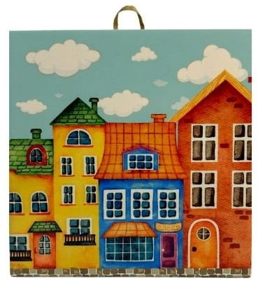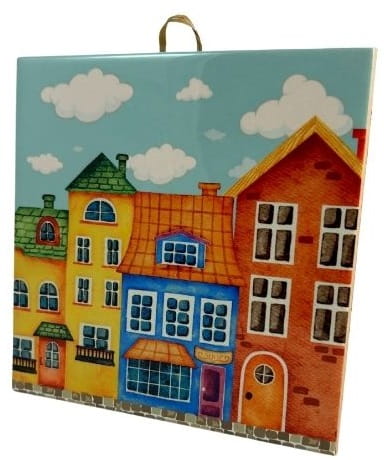 Obrazek kafelek - Domki wykonany jest na płytce ceramicznej i posiada zawieszkę. Jego tył wykańczamy płytą korkową. Obrazek kafelek- Domki przedstawia widok miasta z domkami. Obrazek kafelek - Domki wykonujemy metodą nanoszenia.
