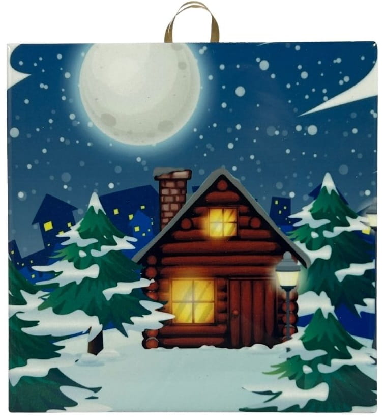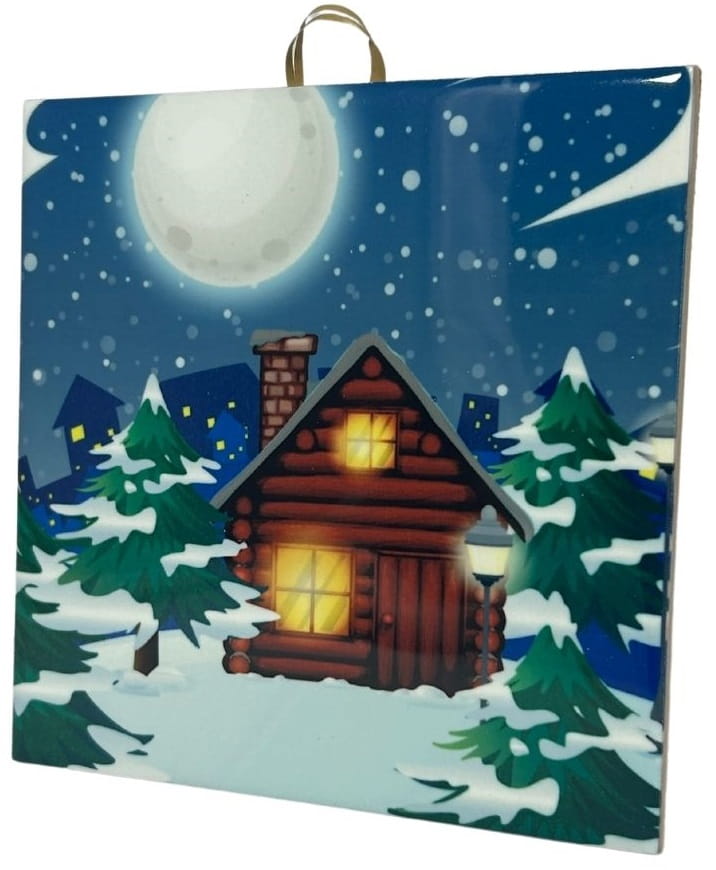 Obrazek kafelek - Zaśnieżona Wioska - Dom wykonany jest na płytce ceramicznej i posiada zawieszkę. Jego tył wykańczamy płytą korkową. Obrazek kafelek- Zaśnieżona Wioska - Dom przedstawia dom z zaśnieżoną wioską w tle. Obrazek kafelek - Zaśnieżona Wioska - Dom wykonujemy metodą nanoszenia.